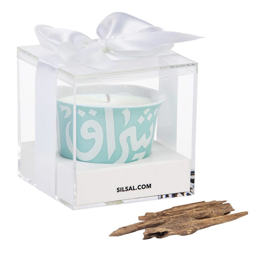 A rather elegant hand-poured candle featuring rich, oriental oud notes, the turquoise porcelain candle holder is decorated with wishes of “Al-Ikbal, Al-Ishraq”, meaning prosperity and radiance. It also comes beautifully wrapped in Saffron Souk signature acrylic box with a satin ribbon. AED 90