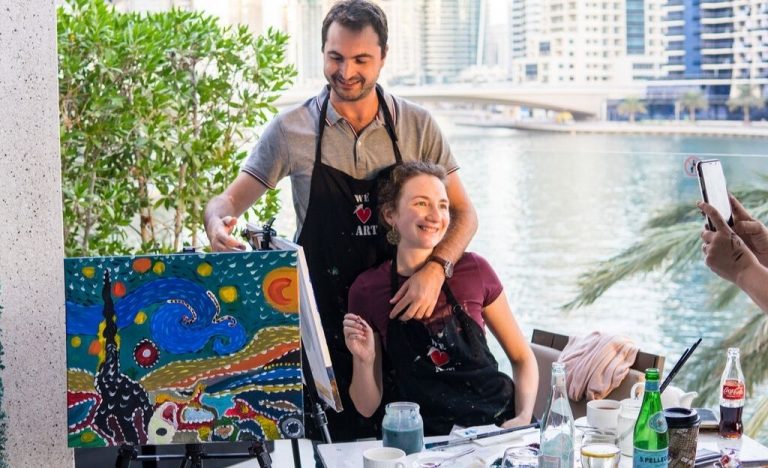 Price: AED 390 per person (inclusive of VAT, all painting materials, pre-sketched canvas, two canapés, 2 glasses of grapes or 4 non-alcoholic beverages).