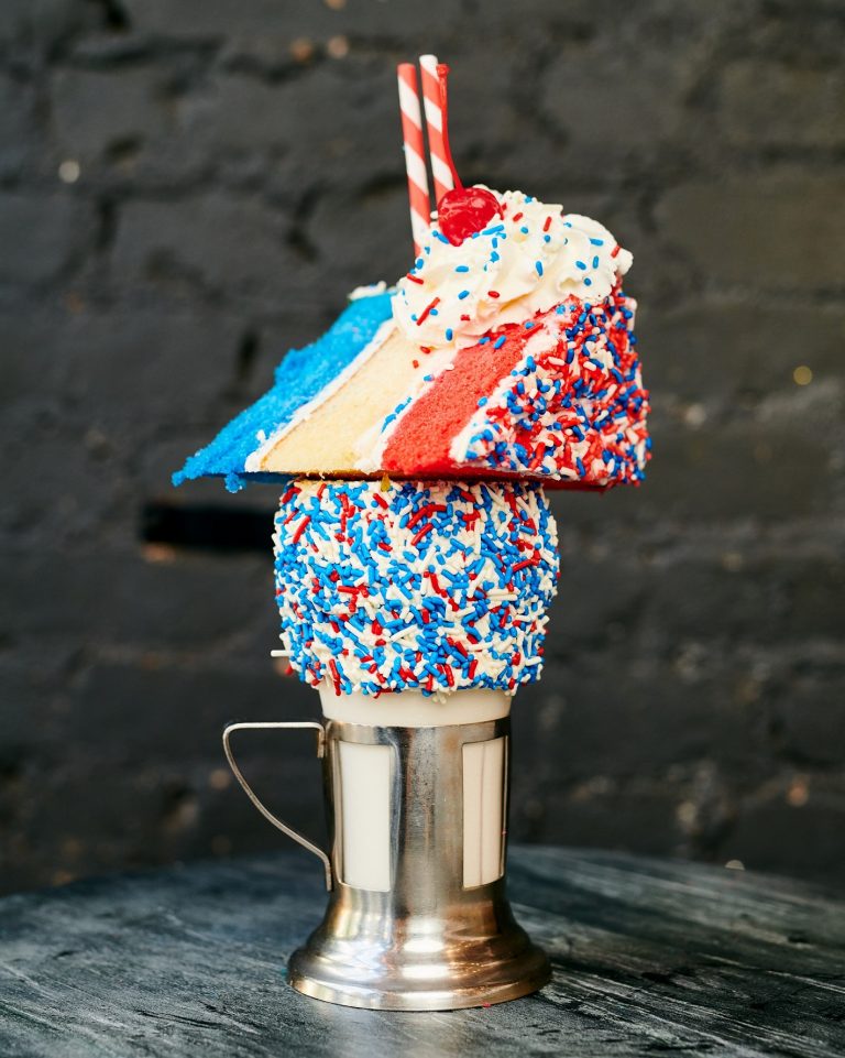 The shake will be an explosion of decadence. It’ll have vanilla ice cream, red, white or blue cake slices, whipped cream, sprinkles – must we go on ?!