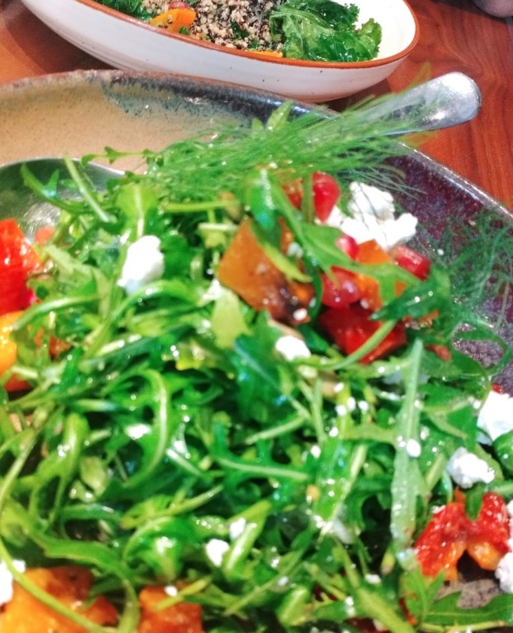 We started off with a mild spicy lentil soup and the server was kind enough to suggest mac and cheese along with sweet potato fries for our little ones. I will be honest, i was tempted to get my hands on a couple of fries and those were one of the best sweet potato fries we have tried in Abu Dhabi! Our tummies were welcomed with Jones Chicken Caesar, Yuzu-marinated roasted pumpkin salad and black quinoa and roasted sweet potato. We have never been too lovable towards greens, but what was served to us was so fresh and tempting, it totally changed my thought process on how healthy and tasty salads can actually be.