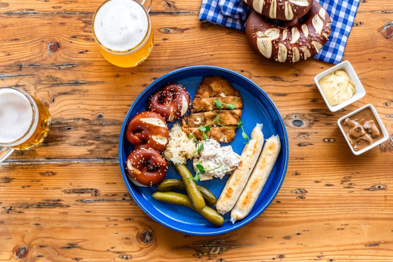 Transport yourself to the heart of Munich as you step into our outdoor venue adorned with vibrant blue and white checkered flags, embracing the true spirit of Oktoberfest. Our enthusiastic staff, dressed in authentic German attire, will warmly welcome you to this lively celebration. Enjoy premium German beer served in classic beer stein glasses, ensuring an authentic experience.