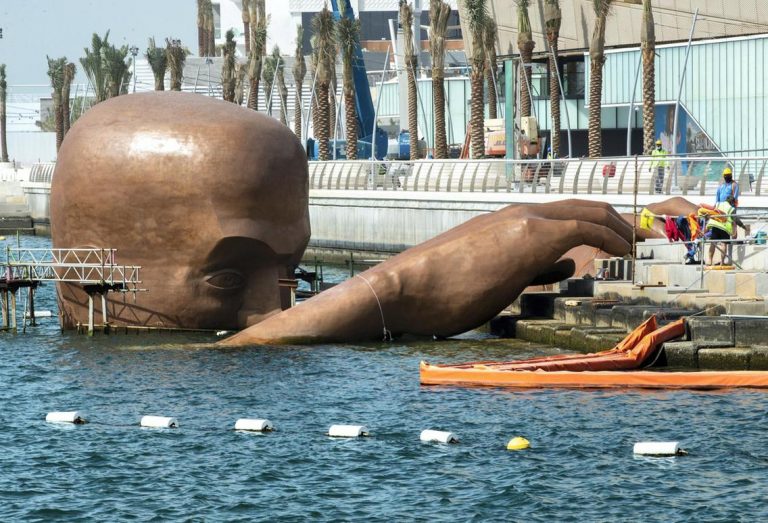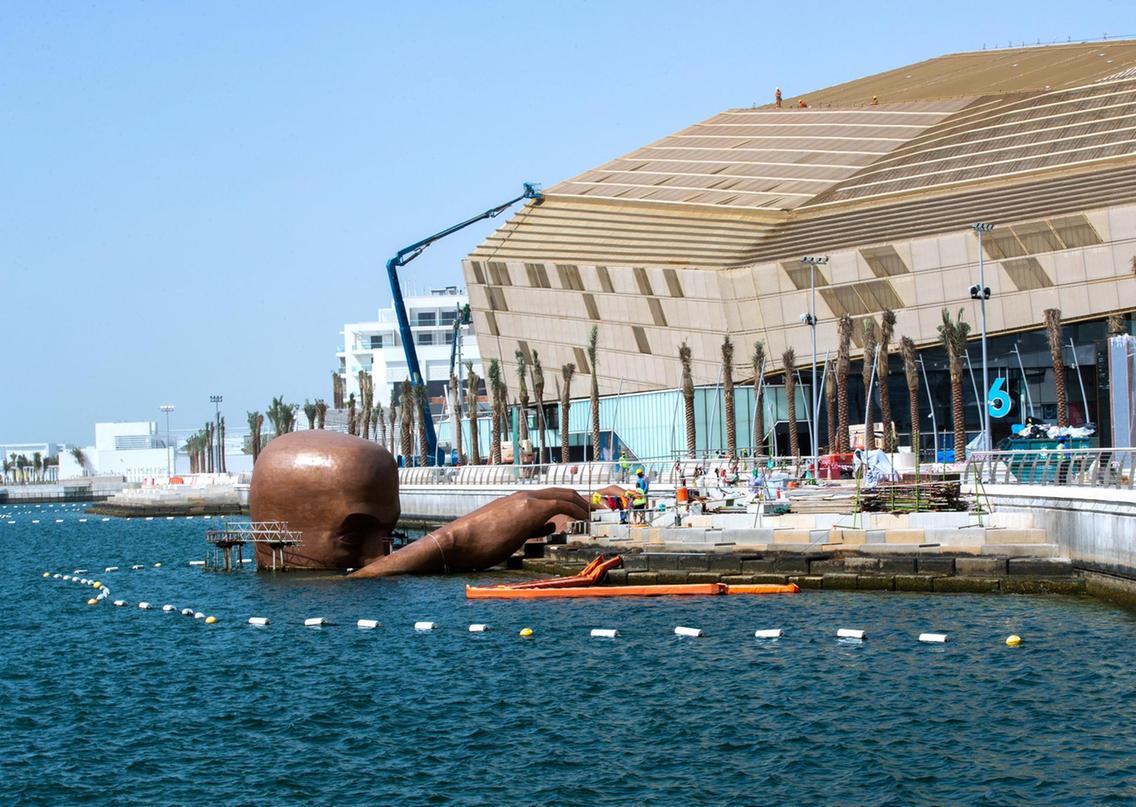 The large sculpture with its head and a hand protruding out of the water sits by the promenade behind Etihad Arena. A photo of the installation was shared by an Abu Dhabi resident on the popular Facebook group Abu Dhabi Q&A. It drew a lot of interest as people wondered where it had come from and what it meant.