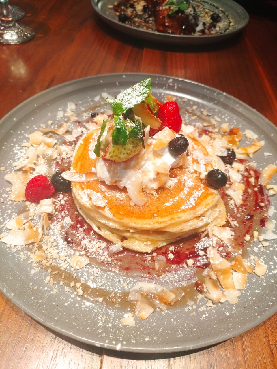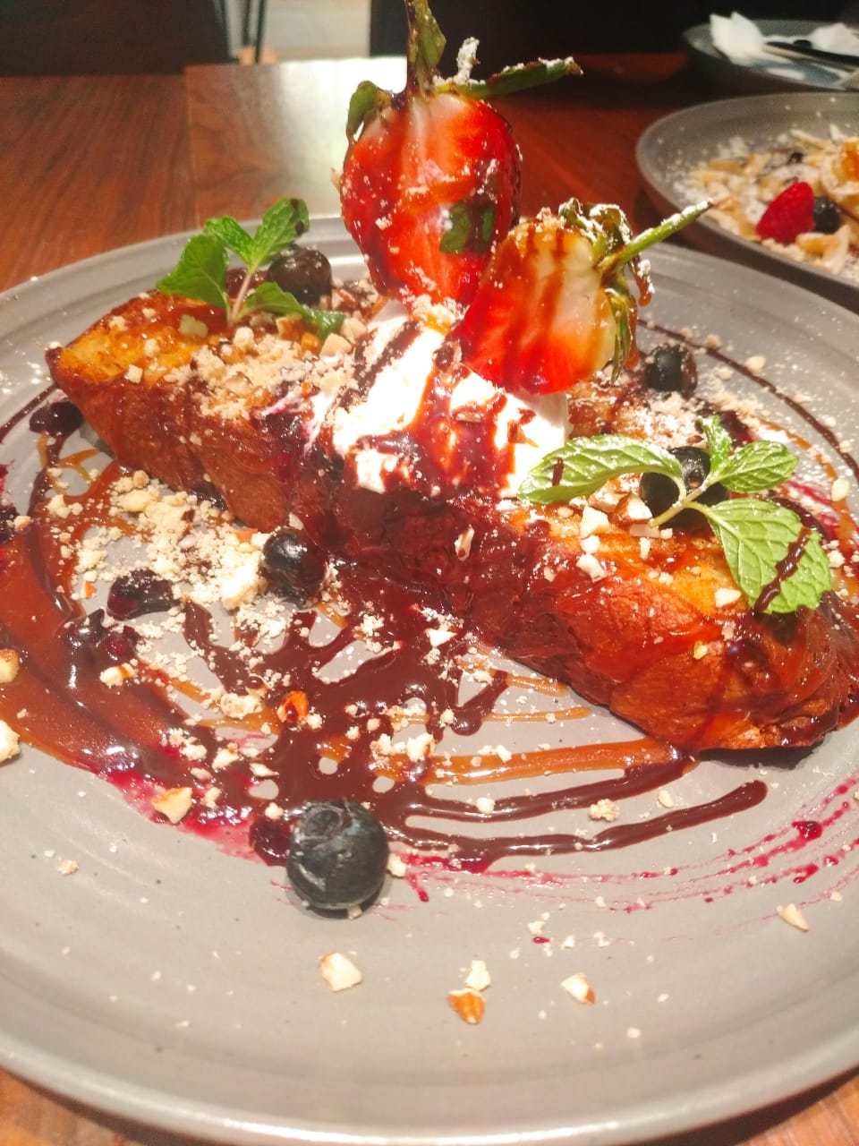 The Jones Traditional English Breakfast had everything from sausages, bacon, hash brown, mushrooms, fried eggs (as per my request), fresh leaves and cherry tomatoes. My husband was served with the Arabian mornings ( true to its name ) which had these spicy beef chorizo sausages, spicy tomato chickpeas, grilled halloumi, poached eggs, labneh, crushed pistachio on multigrain toast. We decided to get going with the morning feast. Honestly the meal was quite heavy and unexpected. All praise to head chef Ashok Goud, who came to our table with that broad smile and asked us if everything was ok ( which is rare in most of the places ) and if we were ready for their famous coconut pancake and Brioche French toast.