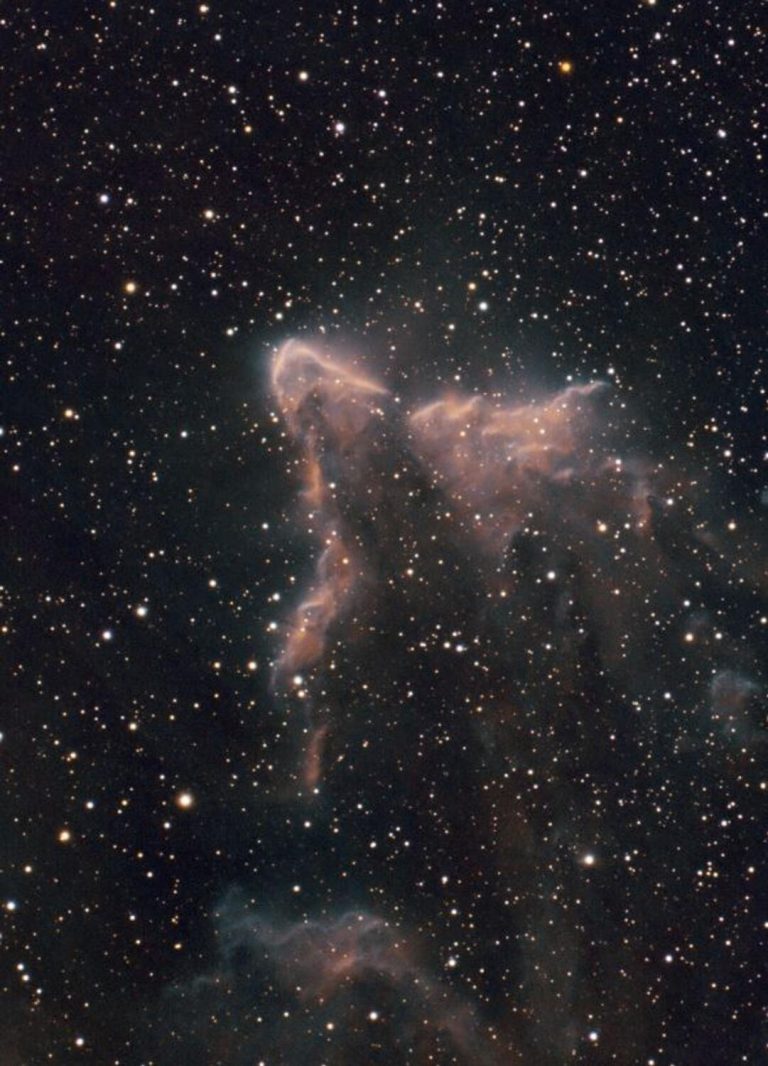 Cassiopeia’s Ghost appears red due to ultraviolet radiation from a nearby giant blue star, Gamma Cassiopeia, which is not visible in the image. The light blue hues result from the reflection of rays off the nebula’s dust, adding to its ethereal beauty.
