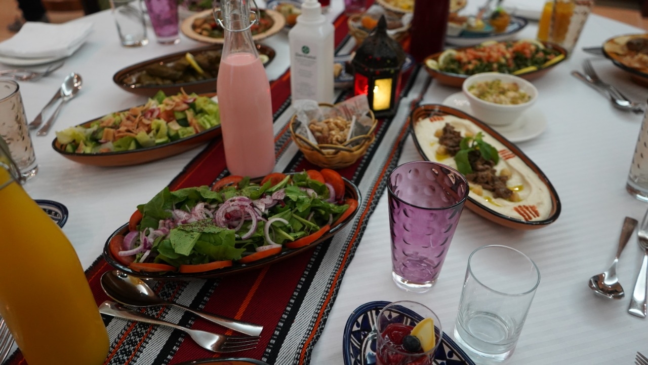 We arrived just in time to be seated before the call to prayer went out and it was time to break the fast. The staff extended a warm greeting at the door and we were offered options of indoor or outdoor seating by the pool.