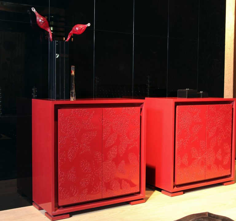 Two red cabinets with decorative pieces on top of them