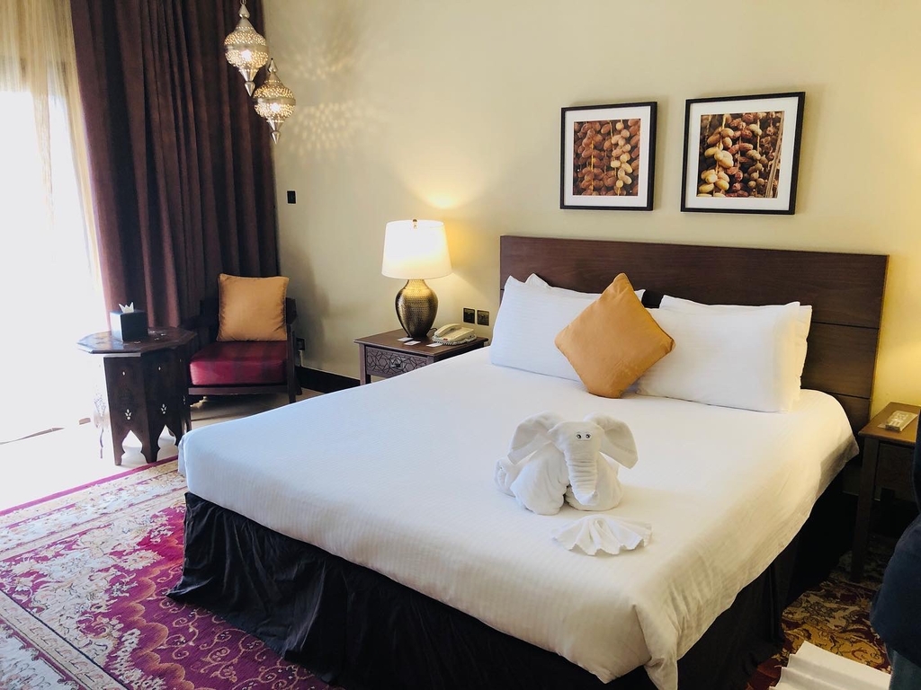 Our room was beautiful, overlooking the infinity pool right in the middle of the desert. We were grateful to the UAE weather which made our staycation perfect. The room was spotless and well sanitized adhering to the Covid-19 precautionary measures. I found it cute with the elephant art-towel on the bed along with a delectable dessert platter. (Probably they read my mind, as I have a sweet tooth!)