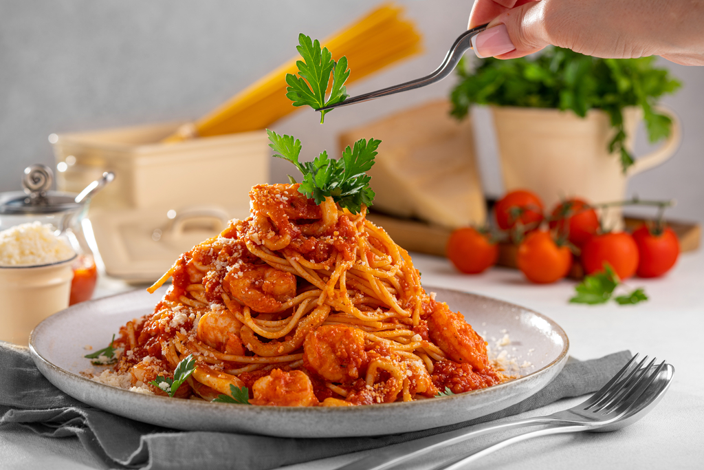 Classic spaghetti, fresh shrimp and calamari in tomato sauce covered with loads of parmesan cheese.