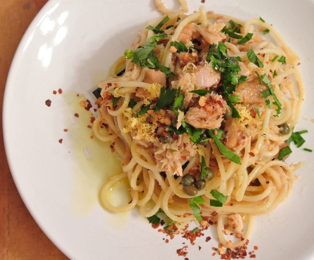 While the pasta is cooking, place the olive oil and garlic in a pan over medium heat. Stir until the onion and cook until softened, then add tinned tomatoes, chilli flakes and bring to a rapid simmer, then add the tuna. Then follow the above steps to add the pasta, season with salt and pepper, and emulsify the sauce. Toss through parsley and serve.