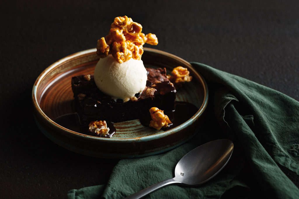 The Choc Walnut Brownie at AED 50 is served with chocolate sauce, vanilla bean ice-cream and salted caramel sauce.